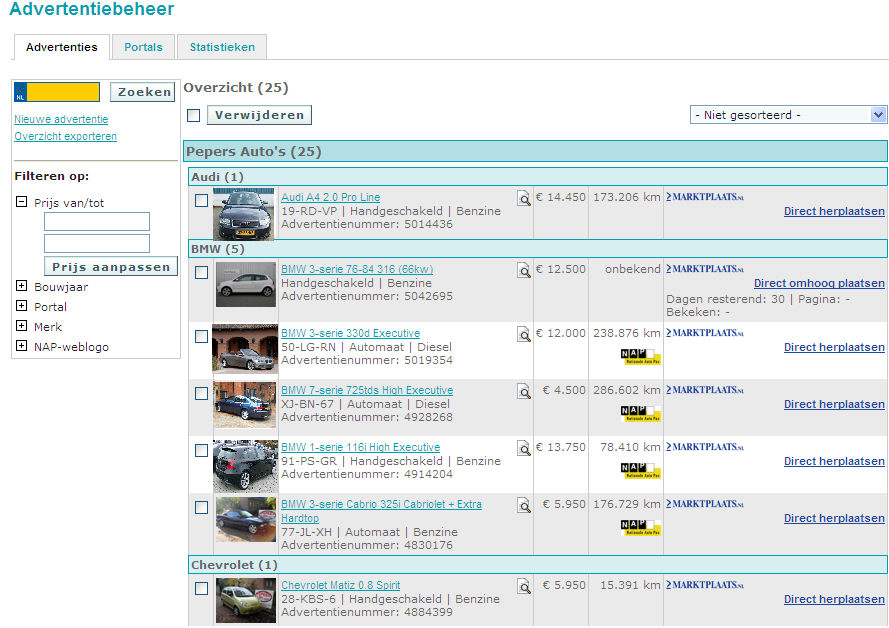 In het scherm Advertentiebeheer worden alle voertuigen getoond die op minimaal één portal